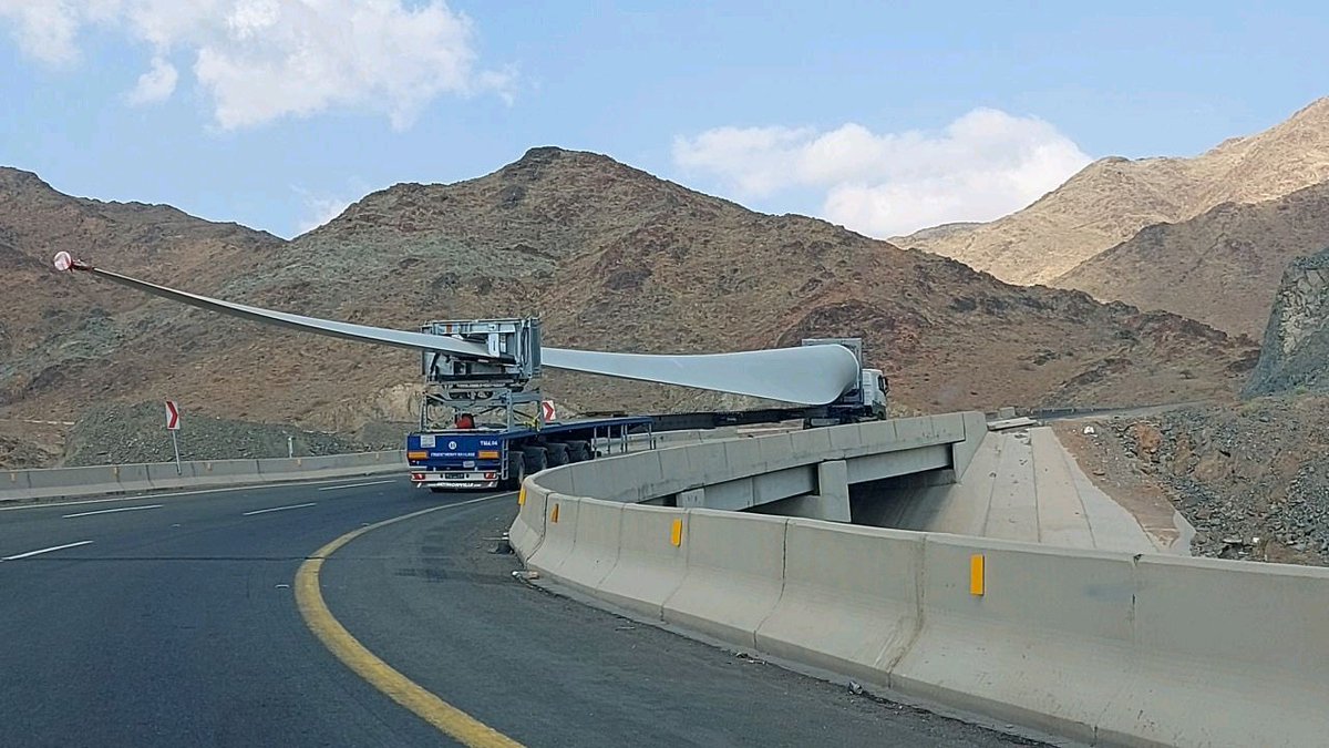 جانب من عمليات نقل بعض قطع مشروع دومة الجندل لـ #طاقة_الرياح إلى موقع المشروع، البالغ عددها 99 مروحة بارتفاع 130 متر