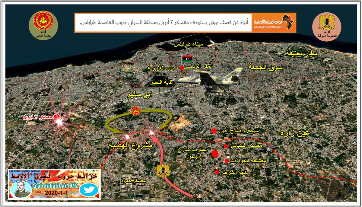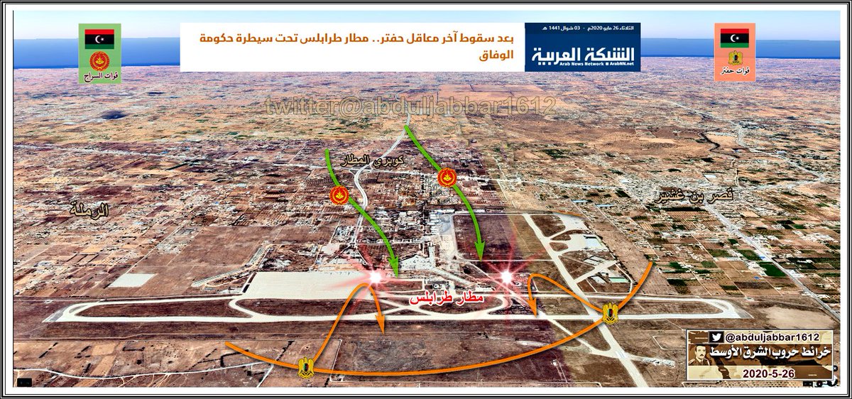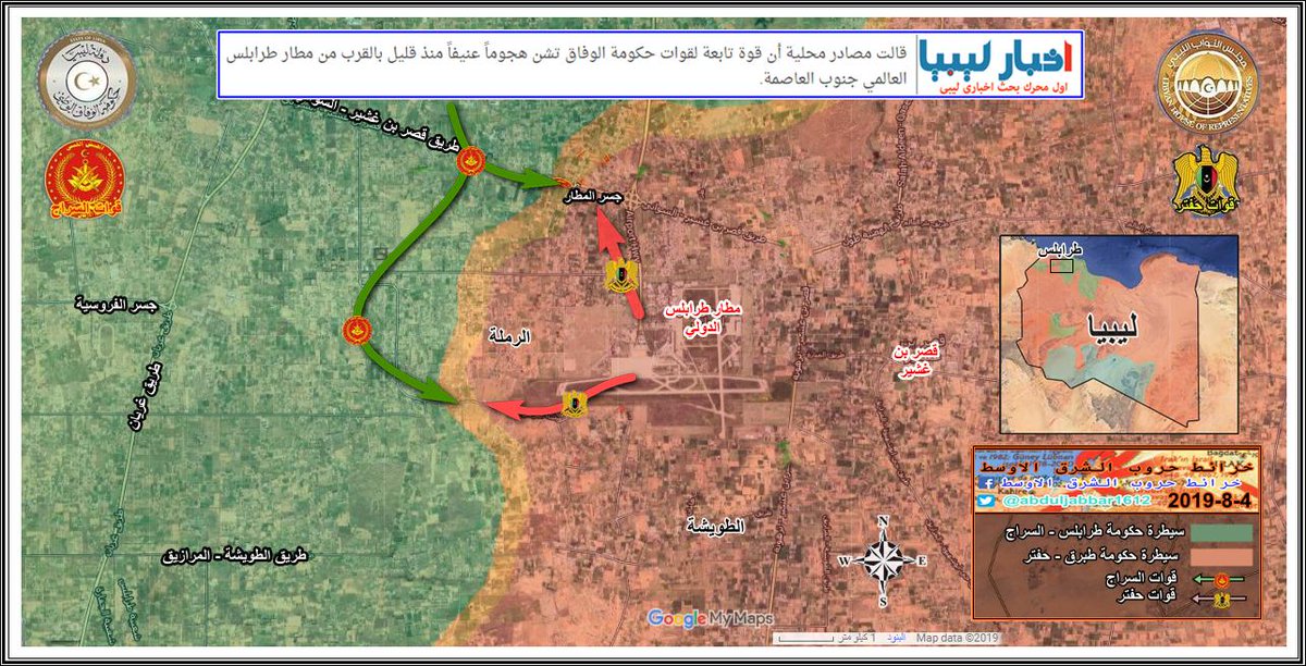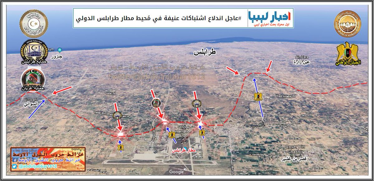 الجيش الوطني ( قوات حفتر ) تسيطر على مطار طربلس الدولي بالكامل وتتقدم الى منطقة خلة الفرجان احد احياء جنوب طرابلس . الخبر نقلا عن @AlArabiya
