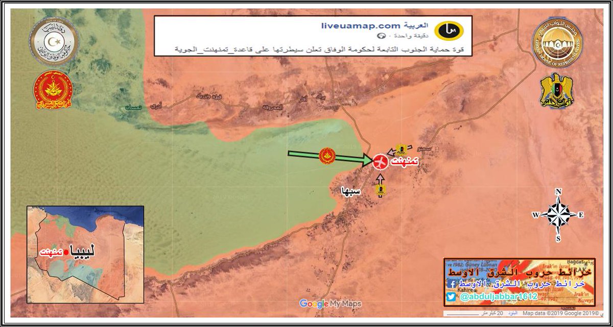قوات تابعة لحكومة الوفاق ( السراج ) تسيطر على قاعدة تمنهنت الجوي في جنوب ليبيا وتطرد الجيش الوطني ( حفتر ) من القاعدة . الخبر نقلا عن ( @Liveuamap )