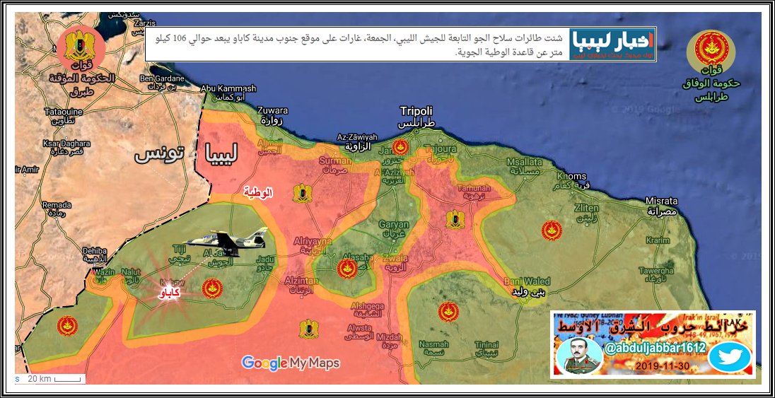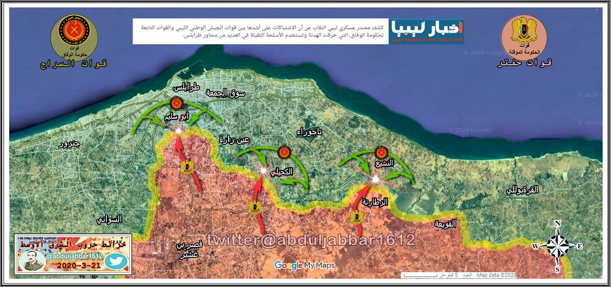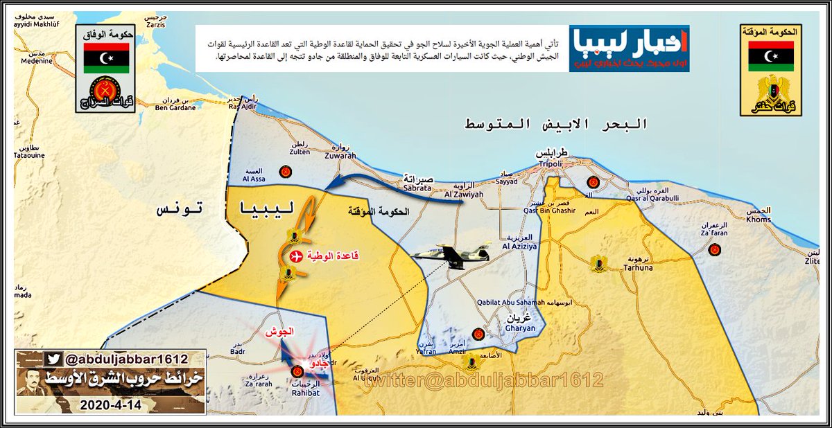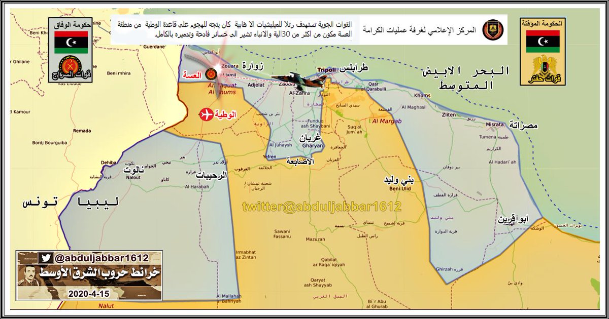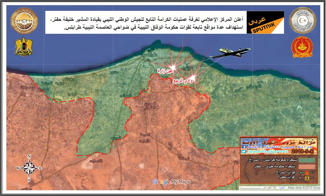 الجيش الوطني الليبي ( حكومة طبرق - المشير حفتر ) يبدأ بالتقدم تجاه مدينة زوارة الساحلية . الخبر نقلا عن حساب ( @Suriyakmaps )