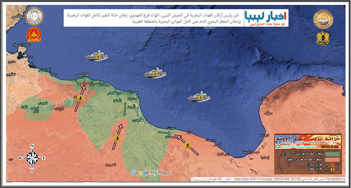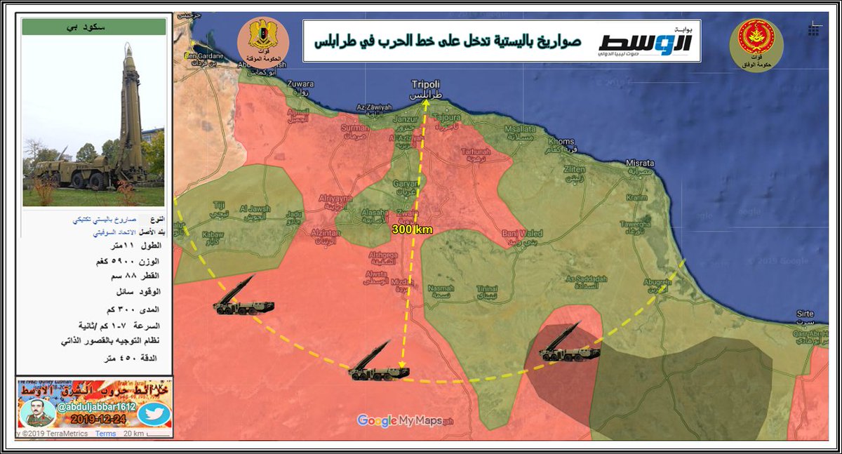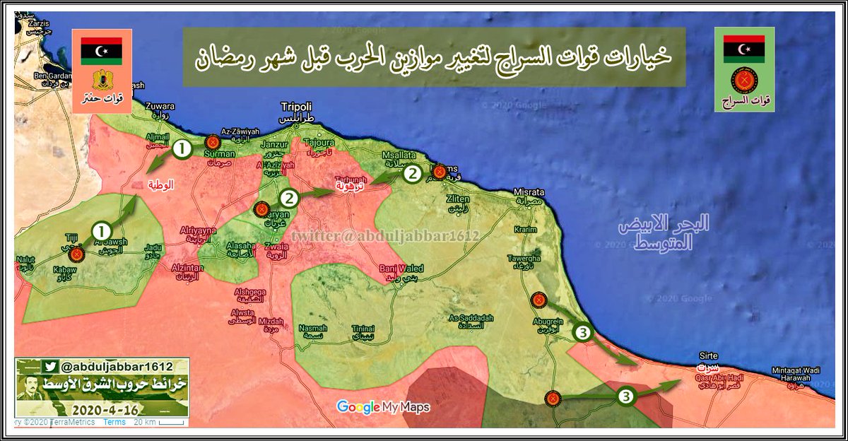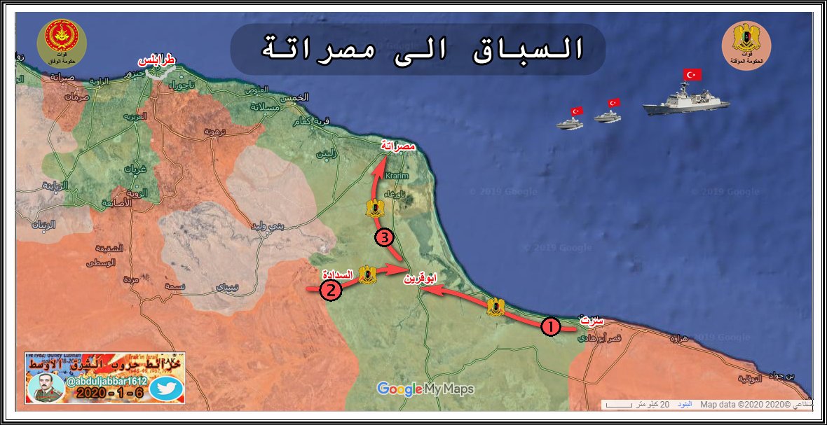 الجيش الوطني الليبي ( حكومة طبرق - المشير حفتر ) يبدأ بالتقدم تجاه مدينة زوارة الساحلية . الخبر نقلا عن حساب ( @Suriyakmaps )
