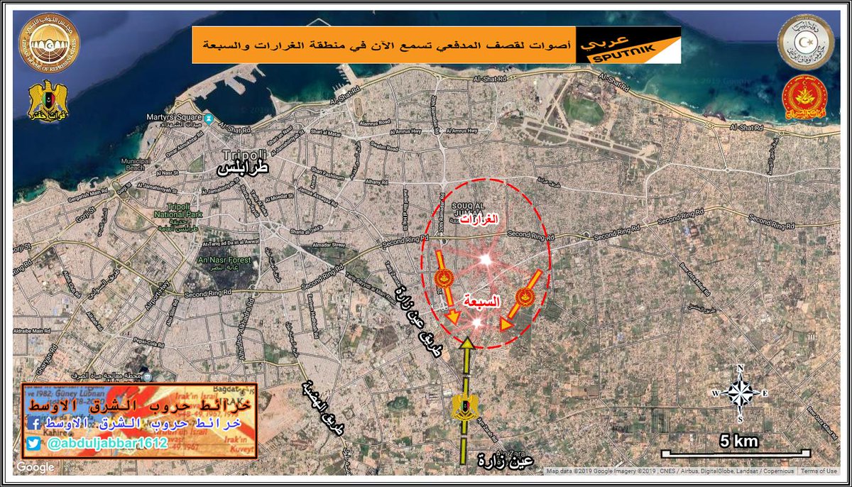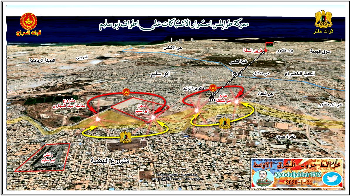 استمرار الاشتباكات في الاطراف الجنوبية لمدينة طرابلس وانباء عن سيطرة قوات السراج على طريق الابيار في محور عين زارة وادي الربيع واقتراب الاشتباكات من الزطارنة في محور القرة بوللي ترهونة .