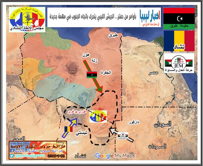 اخر موقف في جنوب غرب ليبيا الجيش الوطني مازال خارج مرزق 50 كم وقبائل التبو منقسمين فيما بينهم قسم مع الجيش الوطني والقسم الاخر مع مسلحي مجلس الانقاذ والمجلس المحلي للمنطقة يريد ان يبقى على الحياد . نقلا عن موقع ( Libya.Liveuamap.com)