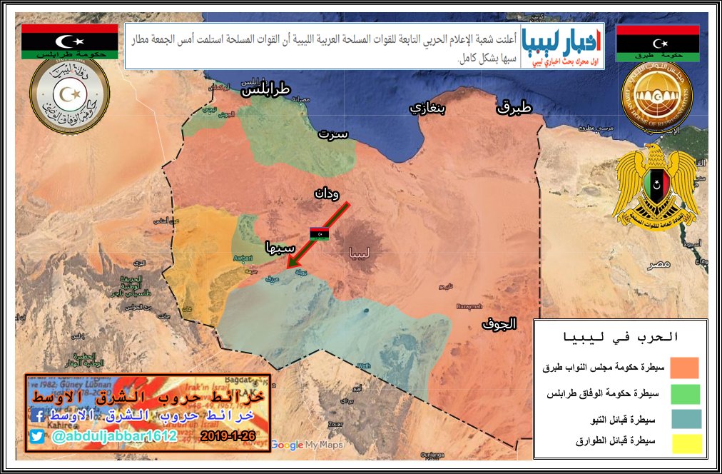 الجيش الوطني الليبي بقيادة حفتر ( حكومة طبرق ) يحرز تقدم في جنوب ليبيا ويسيطر على مطار الويغ في عملية مطاردة الجماعات المسلحة من مجلس الانقاذ التشادي ومسلحين من قبائل التبو المحليين . الخبر نقلا عن موقع ( liveuamap.com )