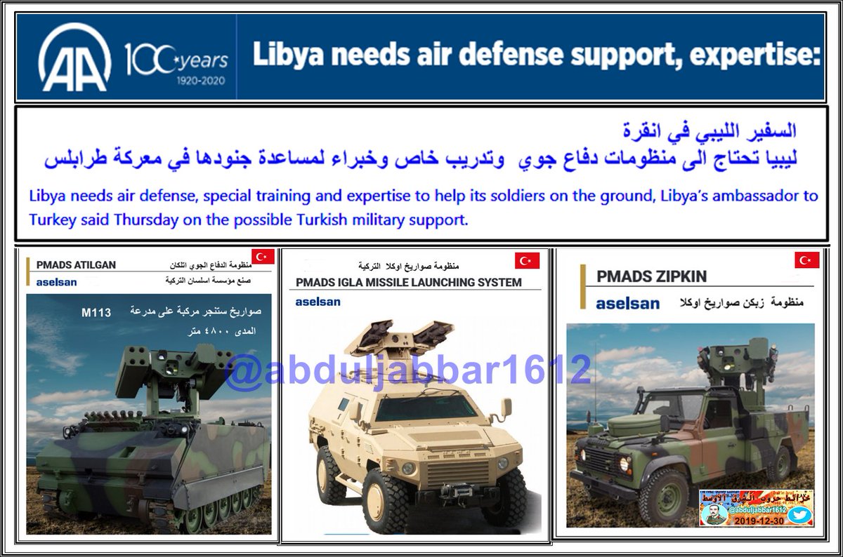 السفير الليبي لدى انقرة يؤكد حاجة ليبيا ( قوات السراج ) الى الدعم التركي والذي يجب ان يتركز على الدفاع الجوي والتدريب الخاص والخبراء . وهذا يعني اقصى مايمكن ان تتدخل فيه تركيا في ليبيا . وهذه اهم الدفاعات الجوية التي يمكن ان تزود بها ليبيا