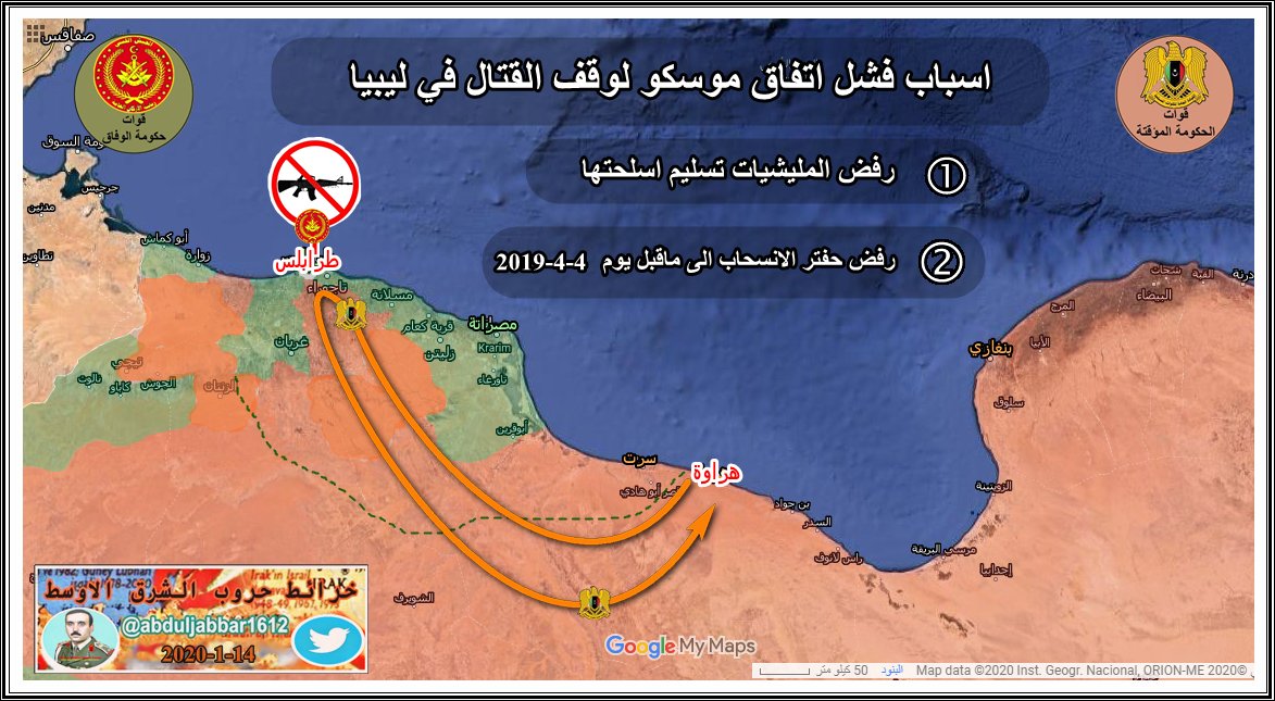 رغم هدنة وقف اطلاق النار استمرار الاشتباكات المترفة بين الطرفين وقيام قوة تابعة لمصراتة بمحاولة تسلل والتفاف في وادي زمزم - طريق النهر وقوات حفتر وطيرانه يتصدى للمحاولة