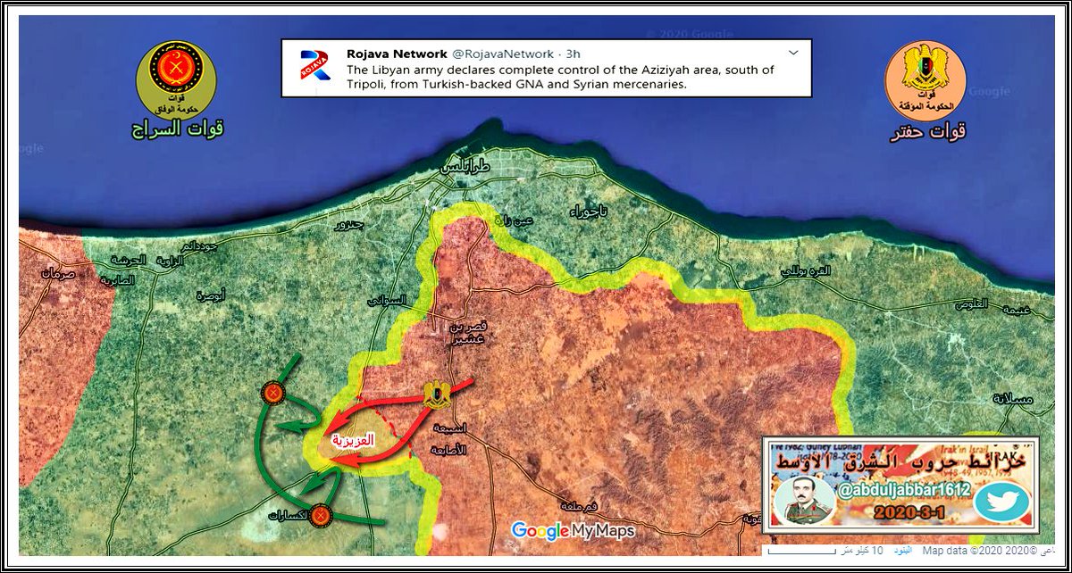 الجيش الوطني ( قوات حفتر ) تسيطر على منطقة العزيزية بالكامل . الخبر نقلا عن ( Libya.liveuamap.com )