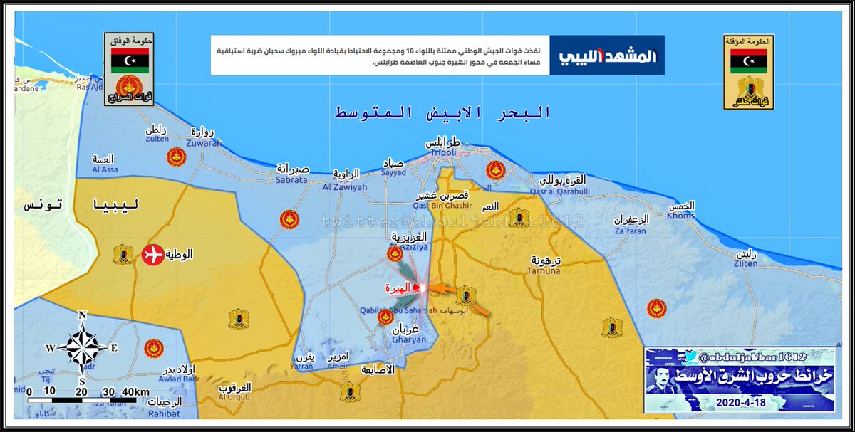 الموقف والسيطرة على الارض في معركة طرابلس وقوات الوفاق تسيطرة على منطقة الهيرة شمال غريان . الخبر نقلا عن ( @EanLibya )