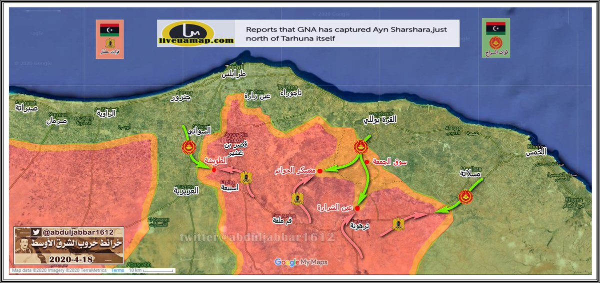 استمرار المعارك شمال ترهونة فبعد سيطرة قوات الوفاق ( السراج ) على معسكر الحواتم وسوق الجمعة وتقارير غير مؤكدة عن السيطرة على منطقة عين الشرارة الى الشمال مباشرة من ترهونة