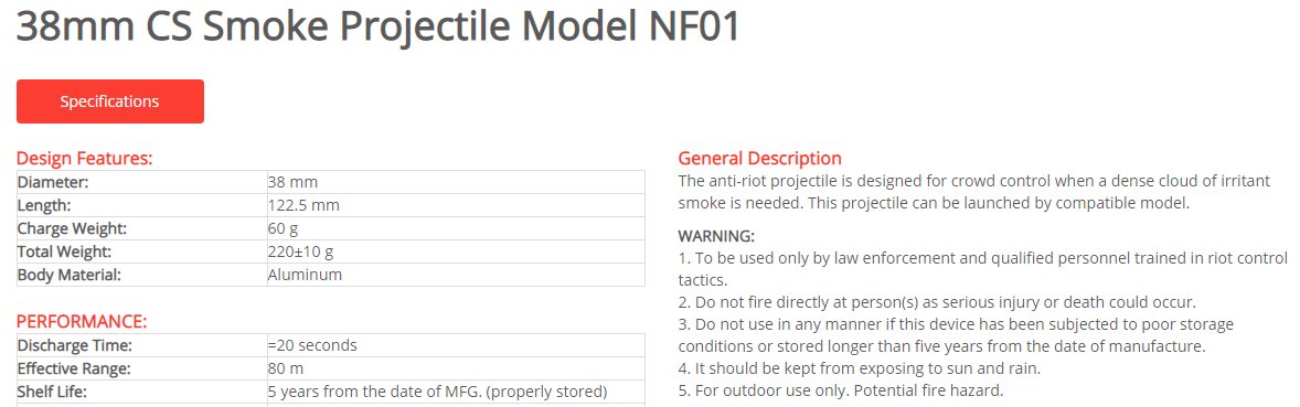 ارشادات الاستخدام: "لا يُطلق مباشرة على الأفراد لتفادي تسبيب اصابات خطرة او الموت."