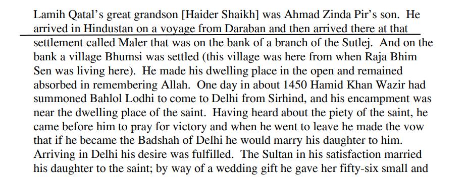 Even Hayat Lodhi clearly attests that Shaikh Sadruddin AKA Haider Shaikh came from Daraban, and not from Sherwan as @acjoshi falsely claimed. Translation of the snippet has been provided by Anna Bigelow