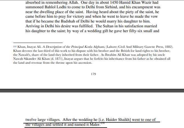 To further expose this item @acjoshi, I quote the primary source Hayat Lodhi.which clearly says "Maler was a name given by Haider shaikh himself" and it wasnt "named after earlier villages Maler and Kotla" as the item falsely claimed.