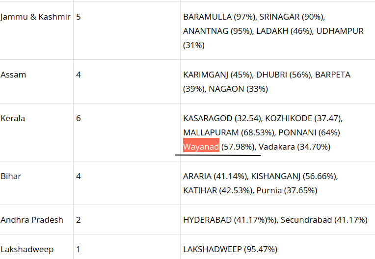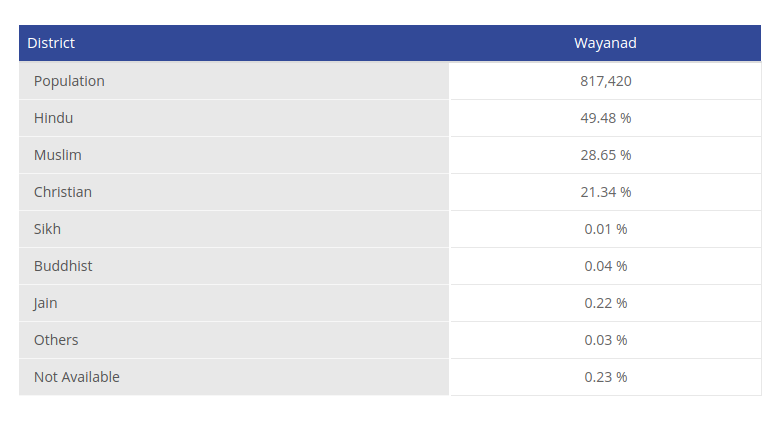 You have given the data of Wayanad DISTRICT, and NOT the Loksabha seat. Wayanad seat has 57.98% Muslim population. It is indeed a Hindu minority seat.