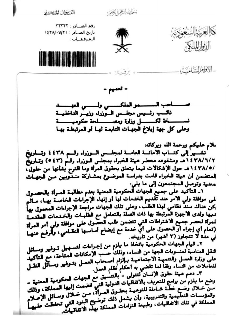 أمر سامٍ يقضي بالتأكيد على الجهات الحكومية بعدم مطالبة المرأة بالحصول على #موافقة_ولي_أمرها عند تقديم الخدمات لها أو إنهاء الإجراءات الخاصة بها