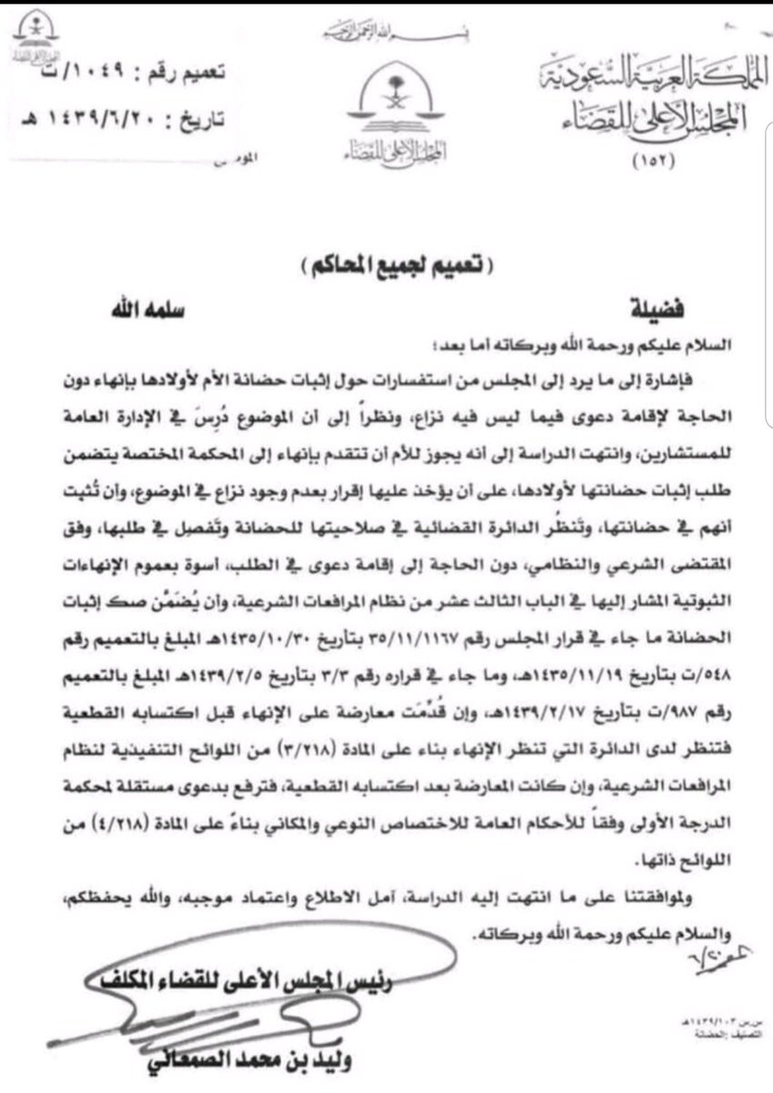 تعميم يقضي بأن على أصحاب الفضيلة قضاة المحاكم مراعاة جانب #المحضون ومصلحته عند #الحكم_بالحضانة لأحد الأبوين