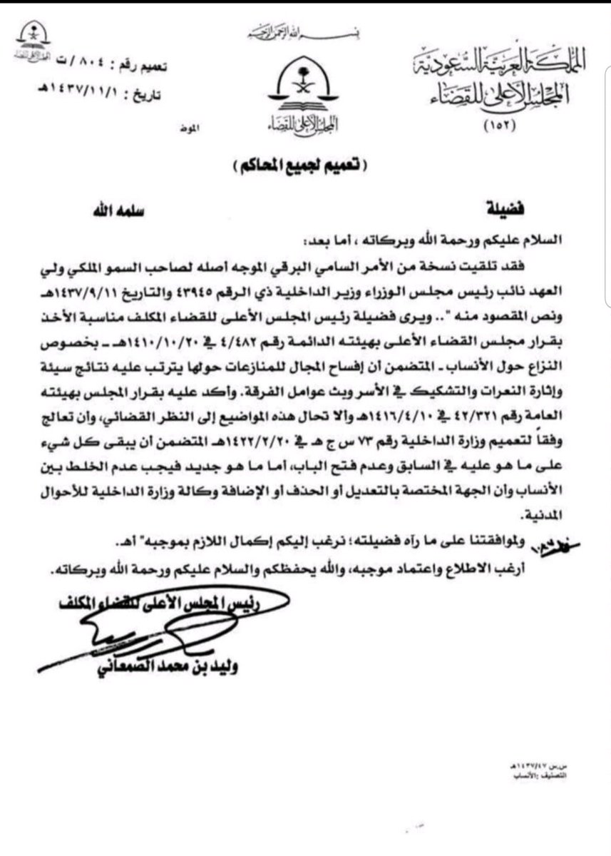 تعميم يقضي بعدم إحالة قضايا #النزاع_حول_الأنساب، إلى النظر القضائي، وآلية معالجتها