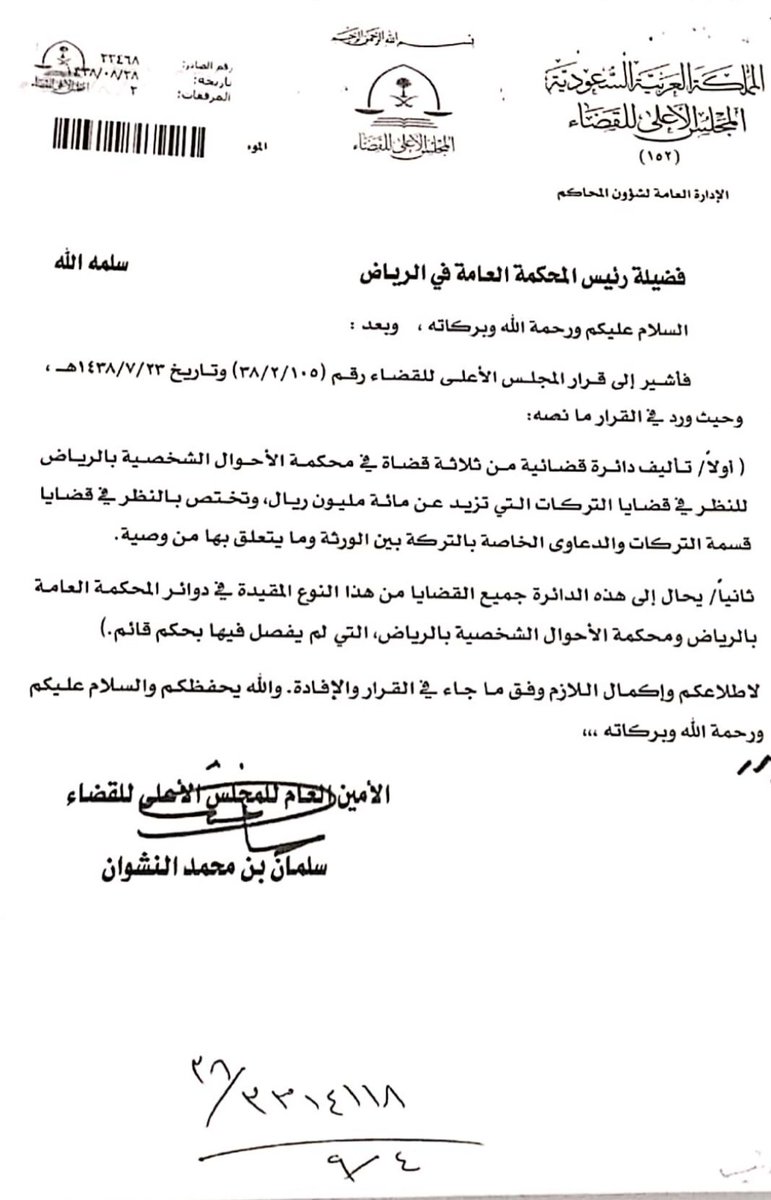 قرار المجلس الأعلى للقضاء بتشكيل دائرة ثلاثية في محكمة الأحوال الشخصية في الرياض بنظر #قضايا_التركات_التي_تزيد_عن_مائة_مليون ريال .
