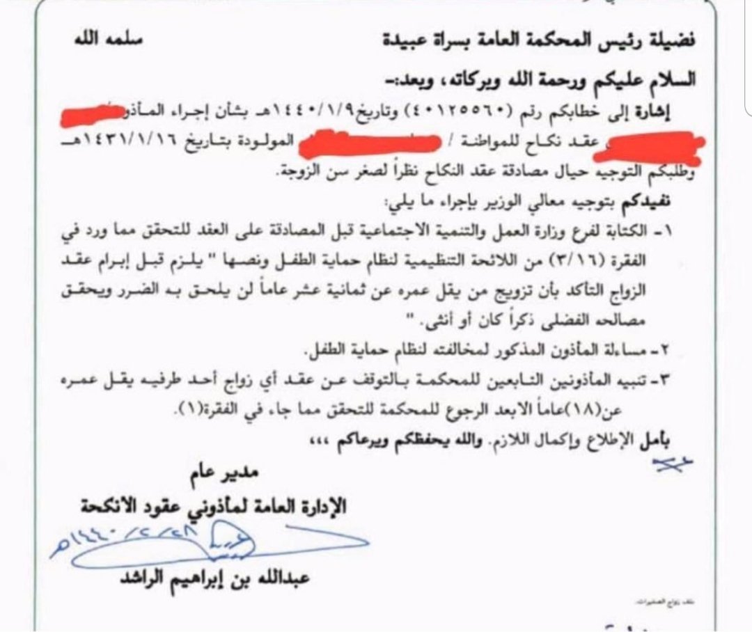 تعميم يقضي؛ بتبليغ #المأذونين التابعين للمحكمة بعدم إجراء #عقود_زواج لمن يقل عمره عن (١٨) وإحالة ما يردهم إلى المحكمة المختصة