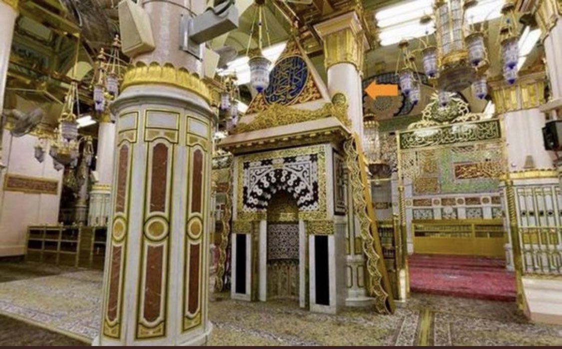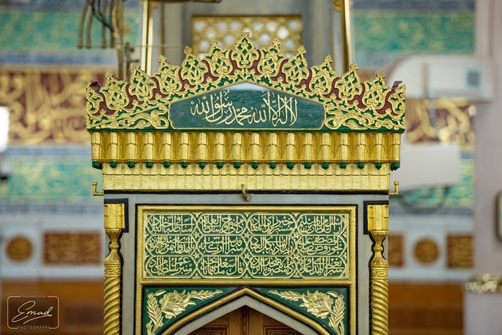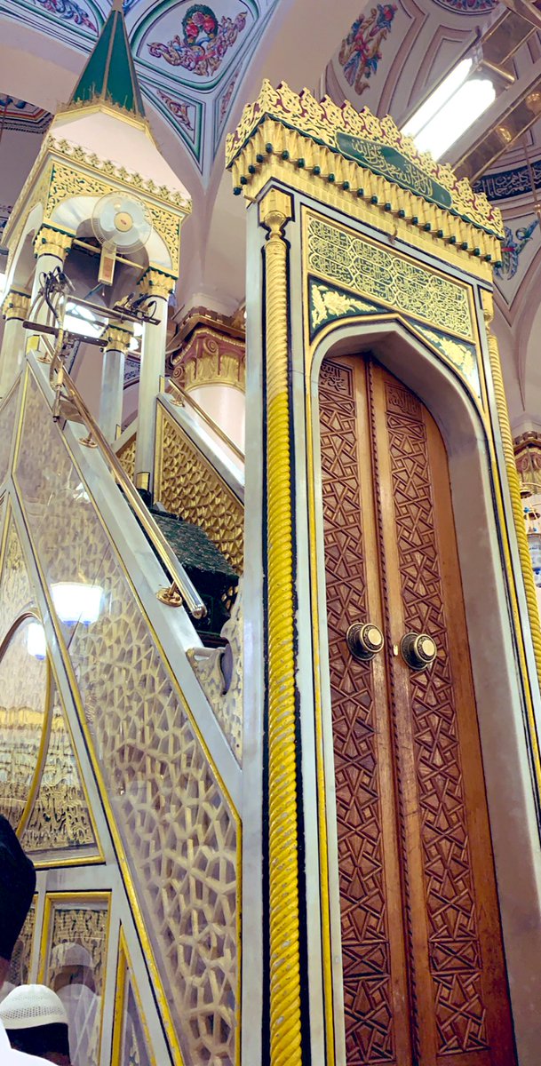 هذا المنبر السابع بنفس مكان منبر النبي ﷺ وأبيات الشعر التي بأعلى باب المنبر الذي أرسله السلطان مراد بن سليم عام 998هـ توضيحها بالصورة الاخرى 🌹