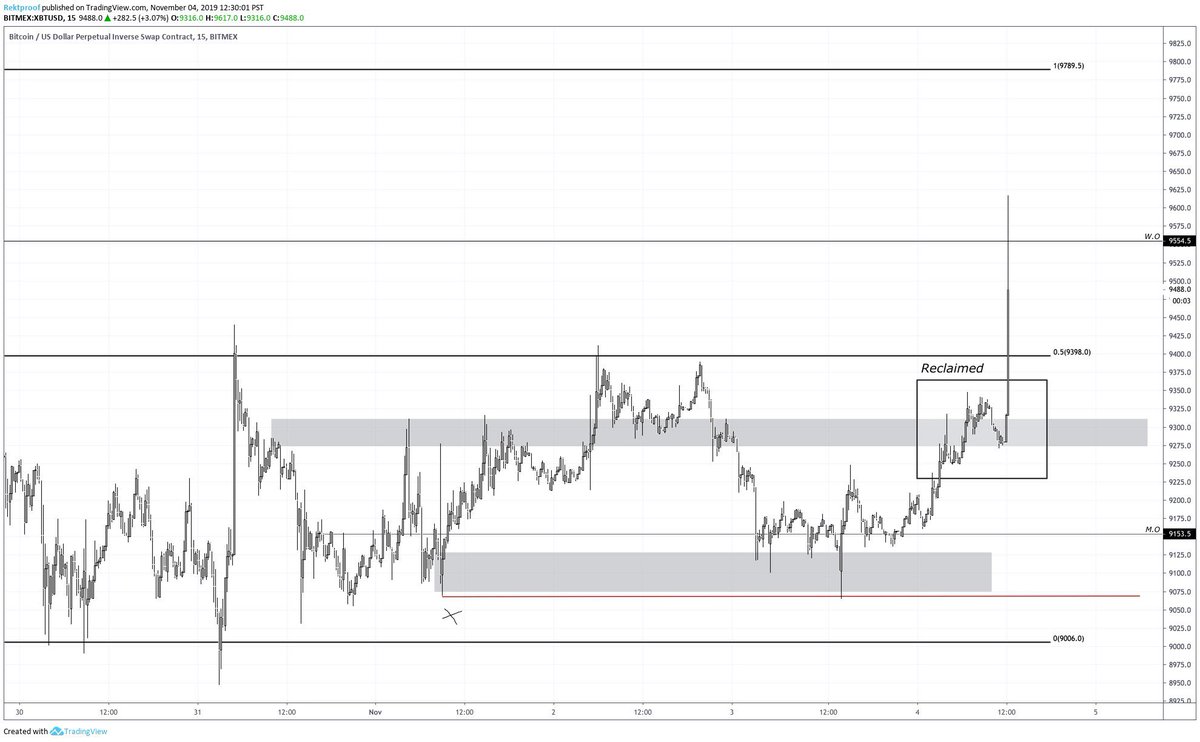 $BTC / $USD As planned. Break of hourly EQ and reclaim. Compounded and added a new long setup. Currently running two separate longs. One aiming for 9900+ highs and the second hourly range high 9789.