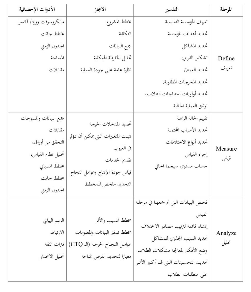 مراجعة المفاهيم الخاصة بجودة التعليم ومنهجية سيجما، وتحديد مدى مناسبتها لظروف المؤسسة.