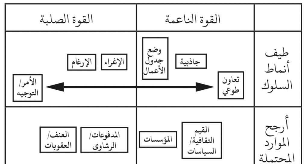 القوة الناعمة (Soft Power): تعمل بجانب القوة الصلبة (العسكرية)، وهي سلاح مؤثر، يحقق الأهداف عن طريق القناع بدلا من الإرغام أو دفع الأموال.