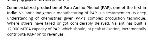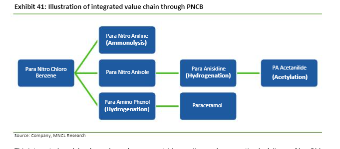 7-5 plants at Sarigam , Tarapur,vapi , Jhagadia, Ahmedabad 8- major revenue from para nitro aniline and parachloro phenol and almost 10-12% revenue from paracetamol 9- Debt is 53 Cr
