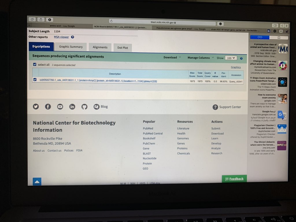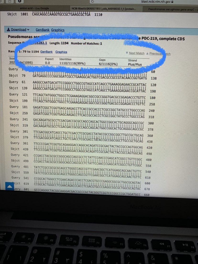 ٤- راح تفتح معانا هذه الصفحة فيها معلومات عن السلسلة الجينية حقتنا والمتشابه معاها من تسلسل جيني اخر ونسبة التشابه والاختلاف وايضا اذا كان في Gap او Mismatched كل هذه المعلومات ممكن نلاقيها هنا 👍🏻😍
