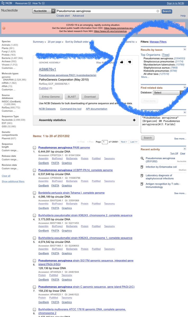 ٣-في البحث ممكن تبحث عن التسلسل الجيني لجين معين في البكتيريا وممكن تبحث عن التسلسل الجيني لكل الجينات في البكتيريا اذا كنت تحتاج جين معين اكتب الجين في البحث وراح يطلع لك 👌🏼✨ ٤-راح نحدد النتائج بشكل ادق لبكتيريا الي نبغاها نختار البكتيريا حقتنا داخل الدائرة في الصورة 👍🏻✨