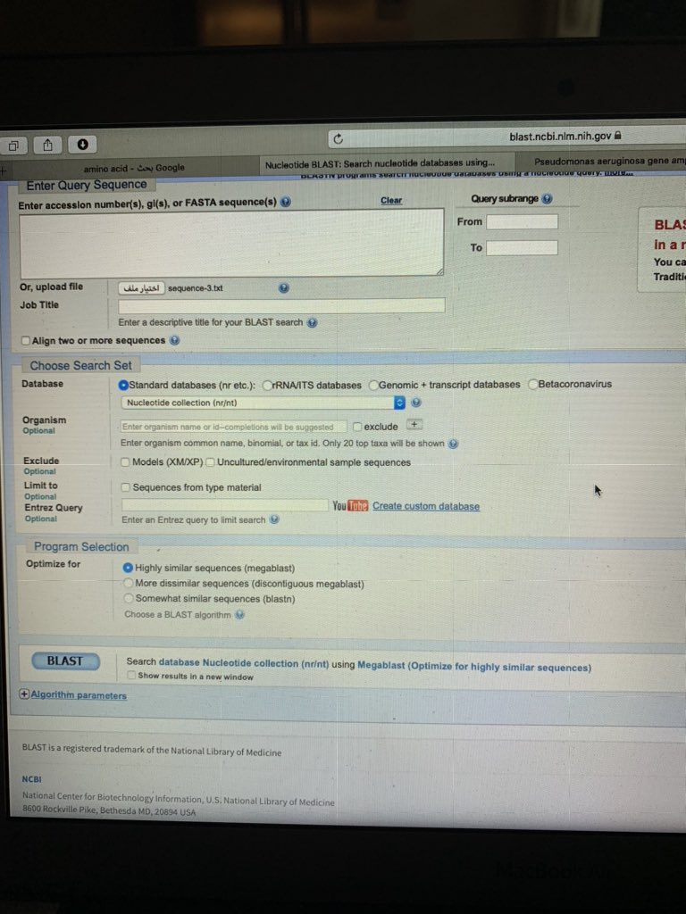 الطريقة الثانية هي Blast بهذه الطريقة نقدر نقارن بين سلسلة جينية واخرى وممكن نشوف السلسلة الجينية حقتنا وتتشابه مع ايت سلسلة 😍👌🏼🧬✨ على حسب السلسلة الي عندك اذا كانت DNA او RNA راح نختار Nucleotide لكن اذا كانت Amino acid راح نختار بروتين 👌🏼✨