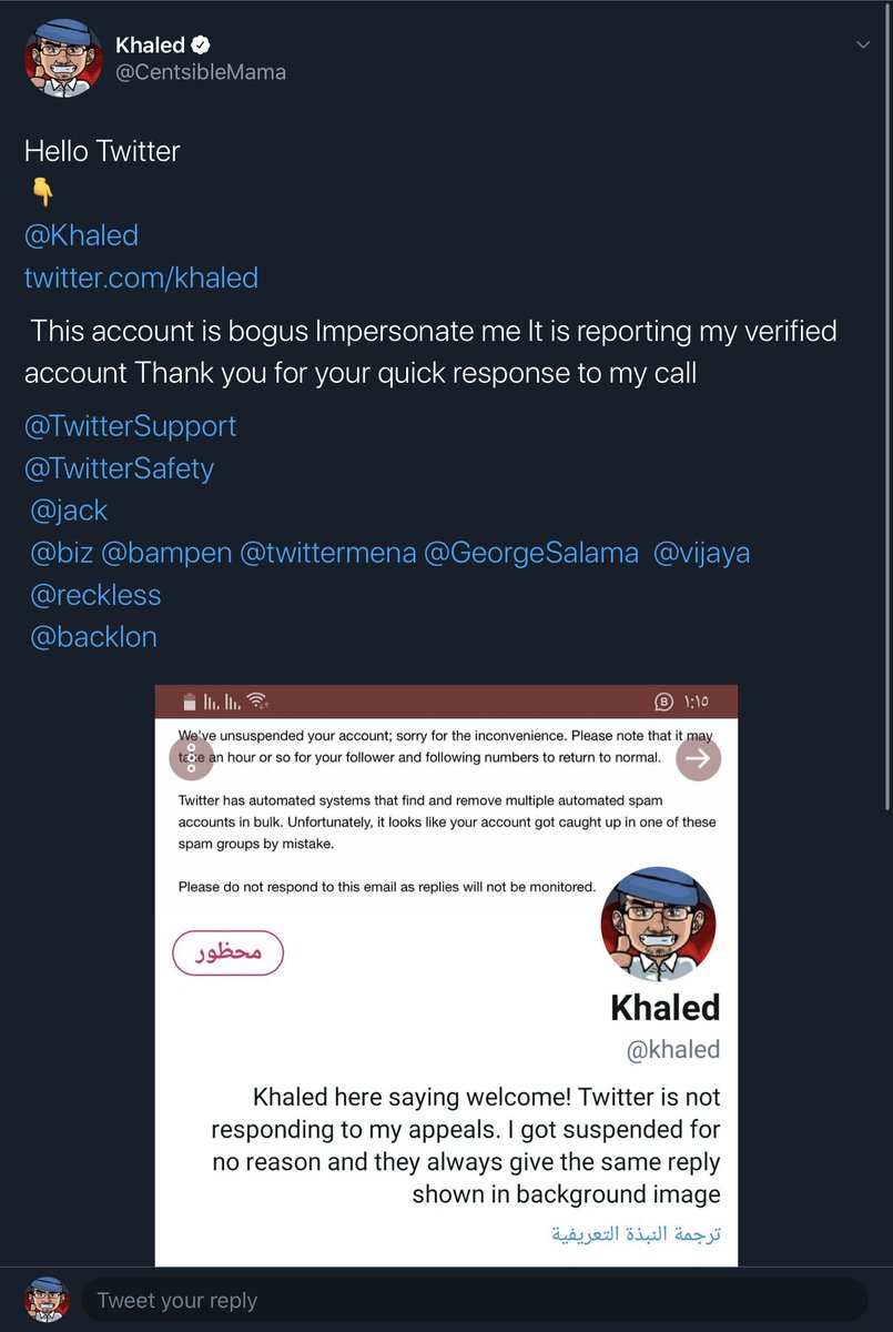 @bampen @jack @TwitterSupport @SaudiMac @biz @GeorgeSalama @TwitterSafety @kayvz @bbb_us @riyadhcinema @ajb_sf @vijaya @b_otyf I believe someone at TwitterMENA is targeting me with these suspensions. I am not sure who can help if the head of twittermena doesnโt even have a verified account. I wish @dickc is back. He responds to people and opened an Arabic support account @da3m that jack shut down