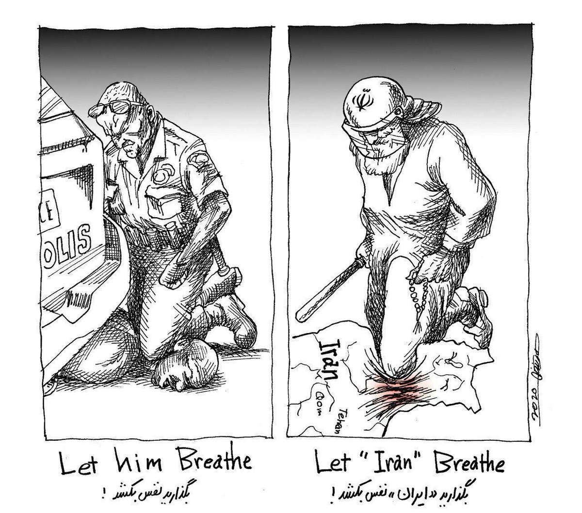 According to this cartoonist, just as Derek Chauvin crushed George Floyd's windpipe, the Islamic Republic is killing Iran.