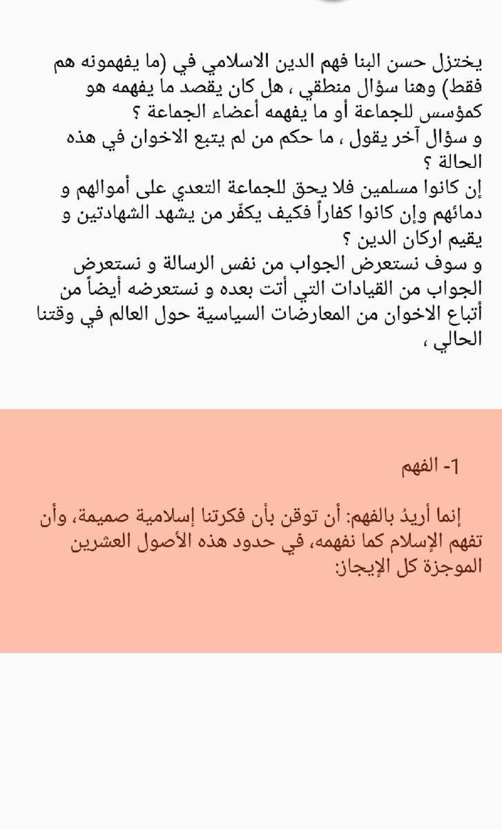 ولا زلنا في الركن الاول للبيعة وهو "الفهم" و أقول ان حسن البنا مؤسس #الاخوان_المسلمين بعد ان إختزل فهم الدين في فهم الجماعة له ، عاد ليقول أن القرآن و السنة هي المرجع فإن كانت كذلك فما دور الجماعة وما الهدف من تأسيسها فقد قال سبحانه