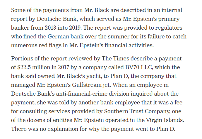 Leon Black paid between $50 million to $75 million to child trafficker Jeffrey Epstein for "advice & services" after Epstein was convicted in 2008. The two often socialized & dined together; payments were sufficiently unusual they drew scrutiny from Deutsche Bank. #OpDeathEaters