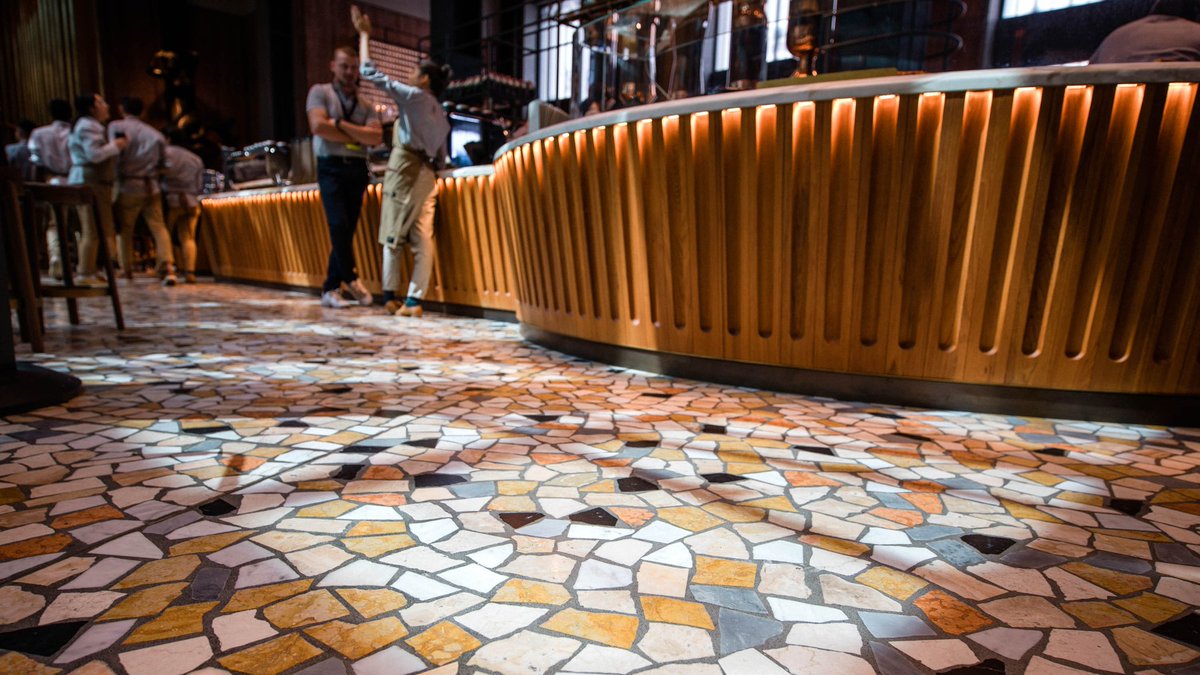 جميع البارات في المحمصة رخامية ودافئة الملمس بفضل الحرارة المشعة بالداخل ، وقد تم نحتها من نفس كتلة 30 طن من رخام Calacatta Macchia Vecchia وهي تستخدم في الديكور والهندسة المعمارية من منطقة توسكان. ✨