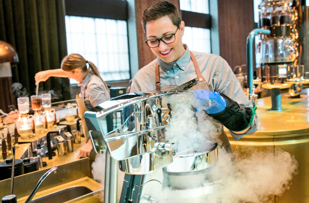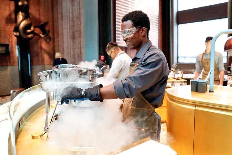يميز ستاربكس ميلان وجود affogato station ويطلق عليها إسم النار والجليد هي محطة فريدة لصنع آيسكريم الجيلاتو بالأفوكادو والإسبرسو مع النيتروجين السائل.🍨☕