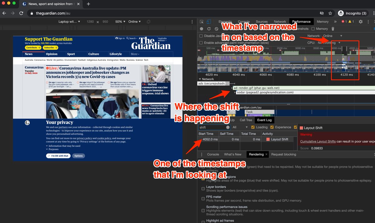 Am still learning, so there's likely better ways of doing this. What would be awesome is if you could click on a timestamp (where it says 4052ms), then that takes you directly to the right spot. Think this needs to be done manually...?