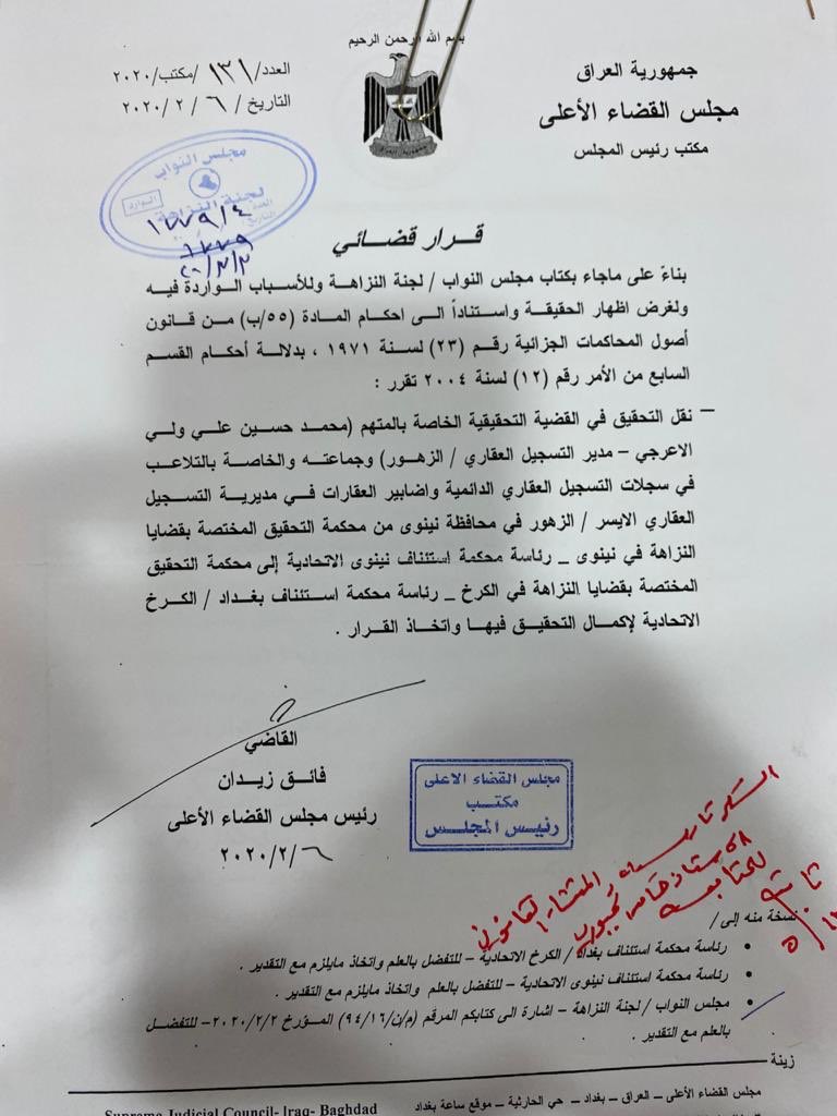 رئيس #القضاء_العراقي فائق زيدان متورط ايضا بملف تزوير الاملاك والاراضي في نينوى حيث اصدر كتاب بنقل دعاوي التزوير التي تطال محمد الاعرجي مدير التسجيل العقاري اقارب قائممقام #الموصل زهير الاعرجي الى محاكم بغداد تمهيدا لاطلاق سراحه