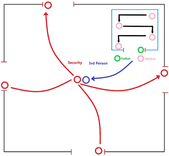 1.السيطرة في محيط البحث الأولي الذي يقع داخل المحل بواسطة الأب الذي أمن المخارج ، وقامت الأم بتمشيط الداخل.