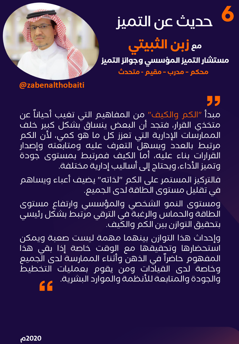 في النشرة (6) أتطرق لموضوع "الكم والكيف" ومدى تأثير ذلك على تحقيق #التميز_المؤسسي تعرف عليه .. وموعدنا بعد العيد إن شاء الله لاستكمال بقية النشرات، تقبل الله من الحجاج حجهم.