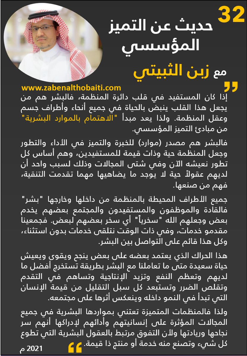 البشر هم أساس التميز في الأداء والتطور وجعل المنظمة حية وذات قيمة للمستفيدين، تعرف على أهمية الاعتناء بهم في النشرة (32) من حديث عن #التميز_المؤسسي.