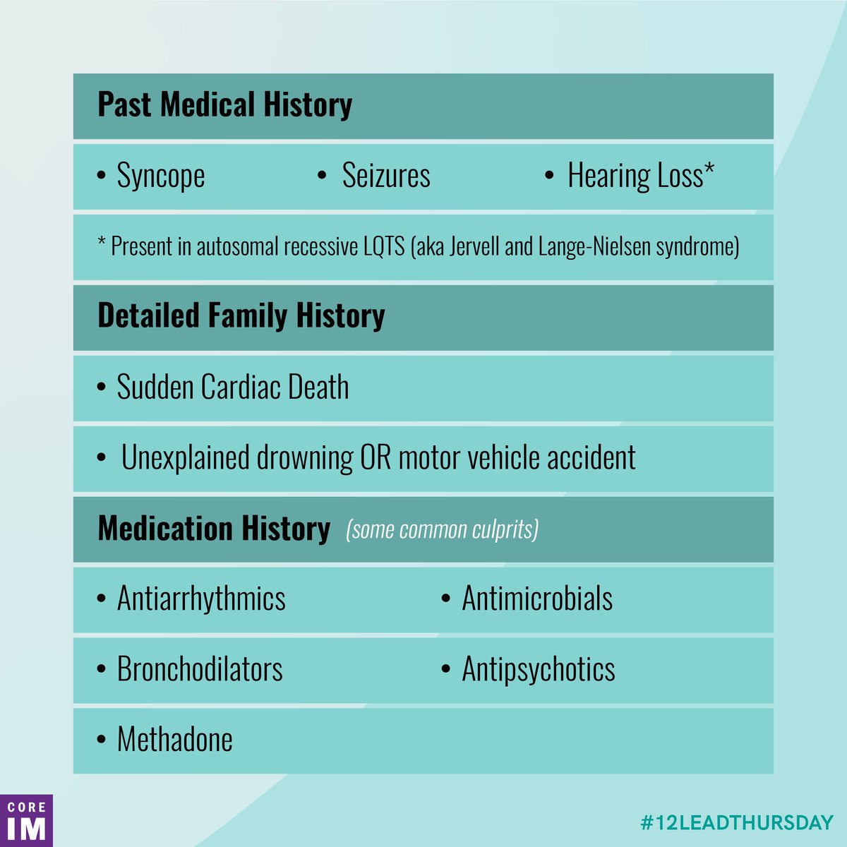 3/ Consider saving the graphic below, designed by @RahulM_MD, in your phone (@grepmeded)! It details the PMH, FH and med hx you’ll want to consider in a patient with prolonged QTc.