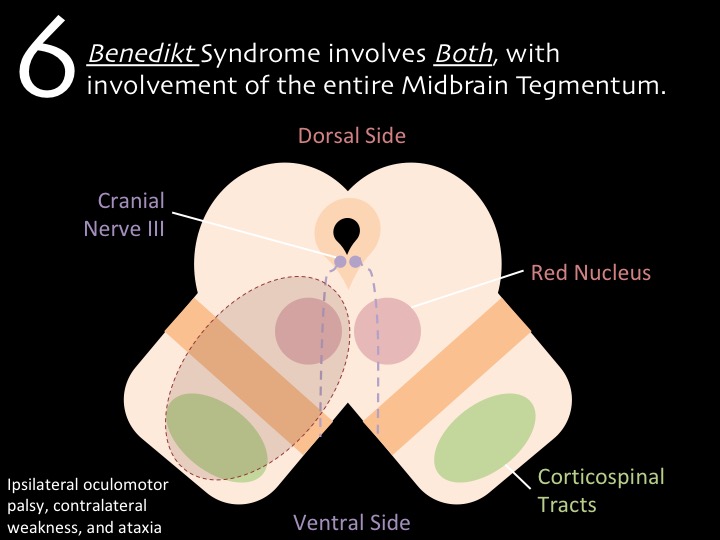 Now the fun stuff 🥳 The classic syndromes of the midbrain all involve cranial nerve III 👁️ -> all resulting in ipsilateral oculomotor palsy. The differences come down to the other tracts involved....