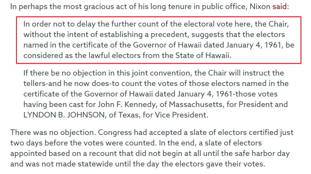 A precedent was set in the 1960 Presidential election between John Kennedy and Richard Nixon. In a close race, Nixon was declared the winner. To meet the "safe harbor" deadline of Dec 13th, Hawaii's Governor signed a certificate of ascertainment for Nixon's electors.