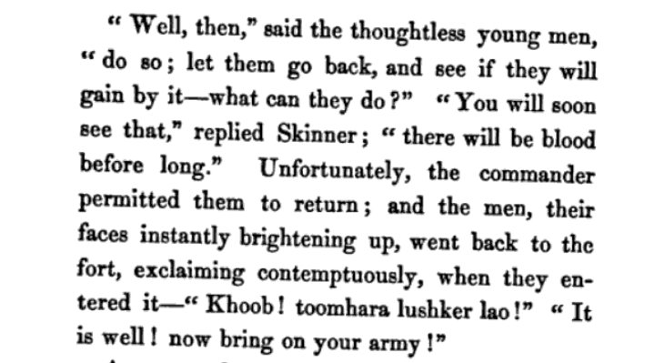 ...The party, thus disabled, retreated; and, being reinforced, advanced again. Again the Rajputs gave their fire with equal effect, and then, throwing down their matchlocks and drawing their swords, quietly awaited the assault. They neither barricaded the gateway,... /9