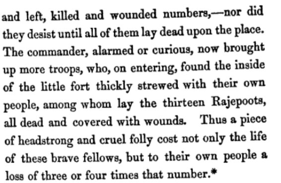 The commander, alarmed or curious, now brought up more troops, who, on entering, found the inside of the little fort thickly strewed with their own people, among whom lay the thirteen Rajputs... /10