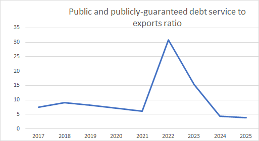 The IMF also keeps tabs on Sudan's debts, but uses different methods. A key metric is debt service to exports ratio - how much export earnings are needed to pay debt. The IMF says that this ratio has been lower than most middle and low income countries - Sudan's been paying less.