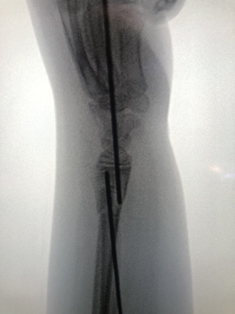 [4/4] I didn’t I think one wire was going to be enough, so I removed joystick and then placed another smooth wire proximal to distal; there wasn’t much room in there because trying not to get the physis. Cast, then pins pulled in clinic at 4 weeks. Xrays done at 2, 4, 8 weeks.