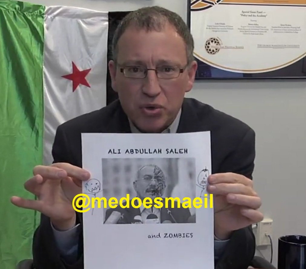 106/ الغريب فى هذه الصورة يرفع #مارك_لينش صورة على عبدالله صالح الرئيس اليمنى الذى تم اغتياله وخلفه علم الثورة السورية هل هي صدفة؟ أم أنها رسالة وإشارة بالاغتيال ؟