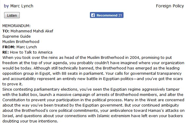 108/ قام #مارك_لينش بمراسلة جماعة الإخوان فى مصر بسرعة عن طريق مذكرة يتحدث فيها عن كيفية التواصل مع أمريكا وسُبل التعاون وإليكم المذكرة من موقع إخوان ويب بتاريخ 21 أغسطس 2007 م .. الرسالة موجهة من مارك لينش لمرشد الإخوان وقتها #مهدى_عاكف 👇